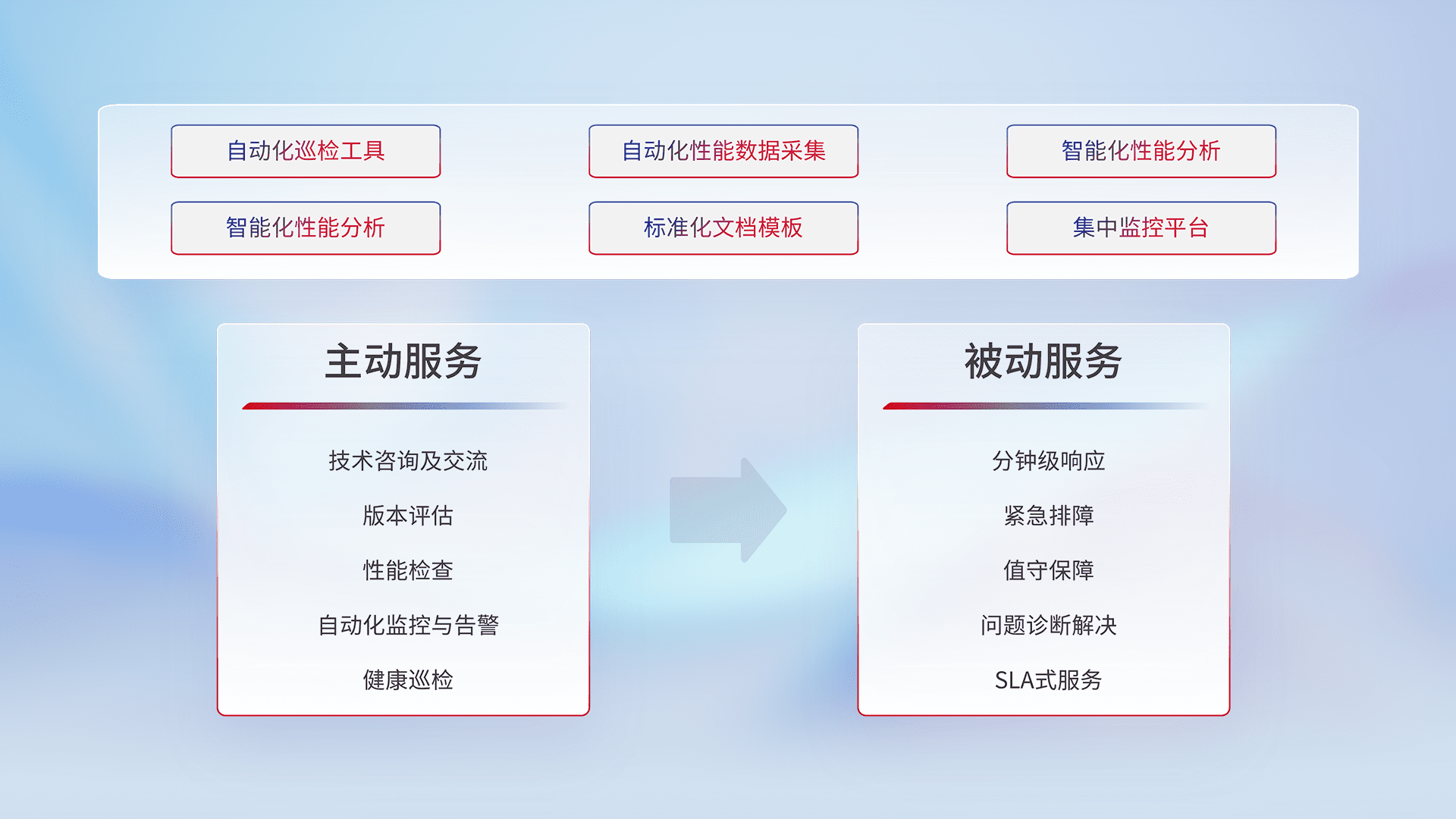 智能化工具和标准化文档,,,,保障服务质量,,提供主动服务(包含技术咨询、、、版本评估、、、性能检查、、、自动化监控与告警、、、健康巡检)和被动服务包含(分钟级响应、、、紧急排障、、值守保障、、问题诊断解决、、、SLA服务)。。。