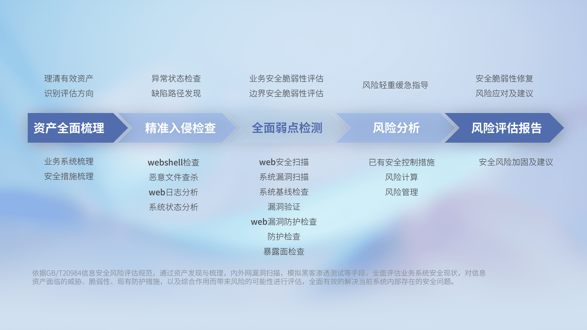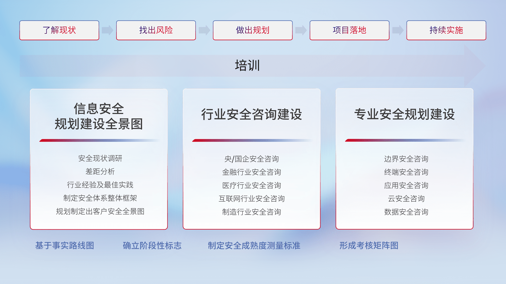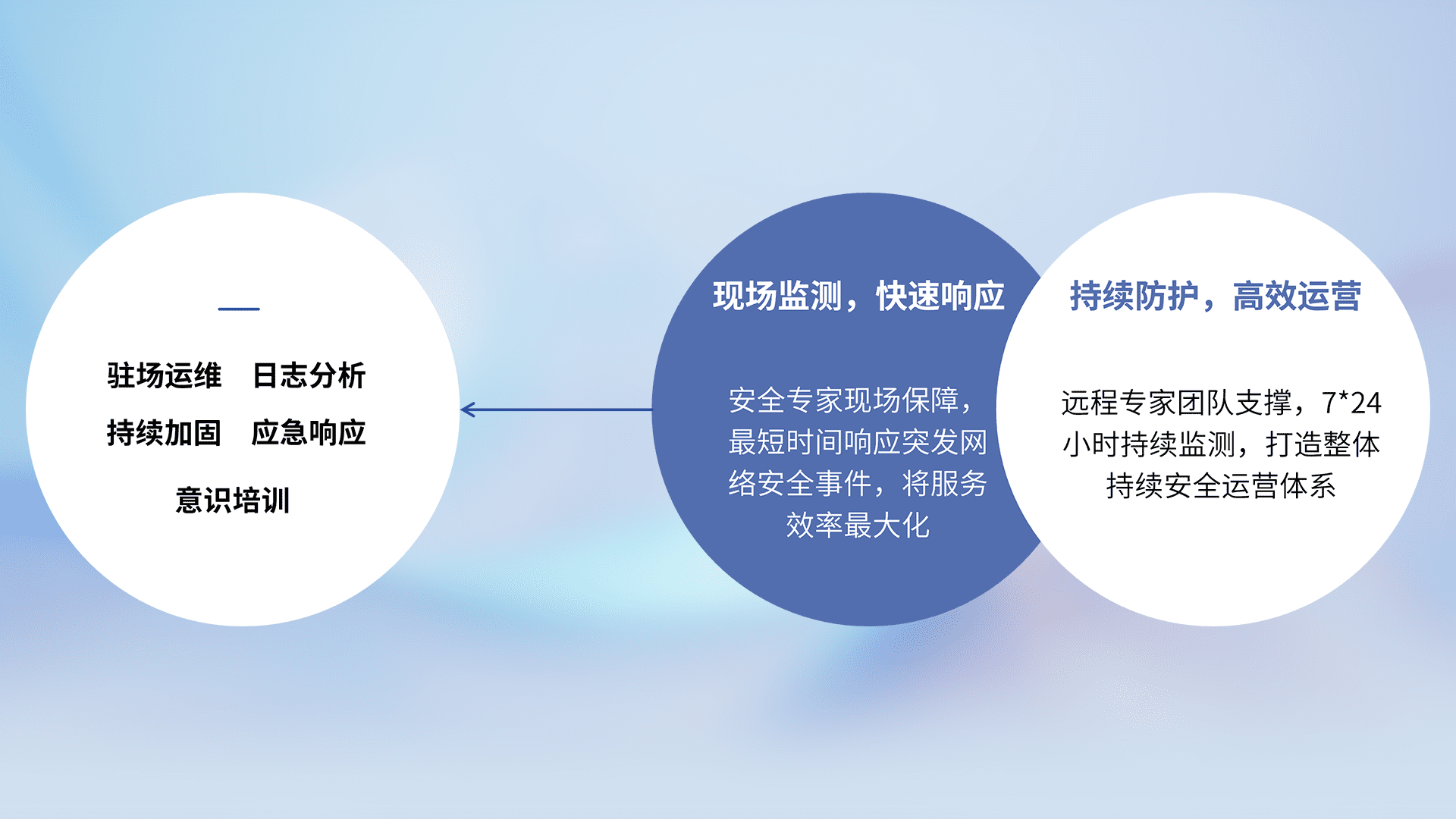 针对客户行业特性,,,,以专业的安全服务+多厂商联合解决方案提供专属的一站式安全管理服务,,帮助客户全面感知网络空间威胁,,,基于识别、、、、检测、、、分析、、防护、、监测、、响应的服务理论模型,,,从方案咨询、、、集成交付、、、评估验证、、、、优化加固、、、、运维运营,,,致力于为客户提供完整的闭环管理式安全服务。。以实战经验为客户打造高抵御风险的安全体系,,,,帮助客户发现威胁、、、、对抗威胁、、、处置威胁,,不断积累安全对抗能力,,,持续保障数字化安全。。。
